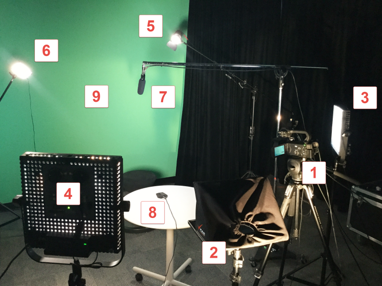 Equipment include all the cameras, lights, microphones, teleprompters, monitors, and backdrops to make shooting your video easy.